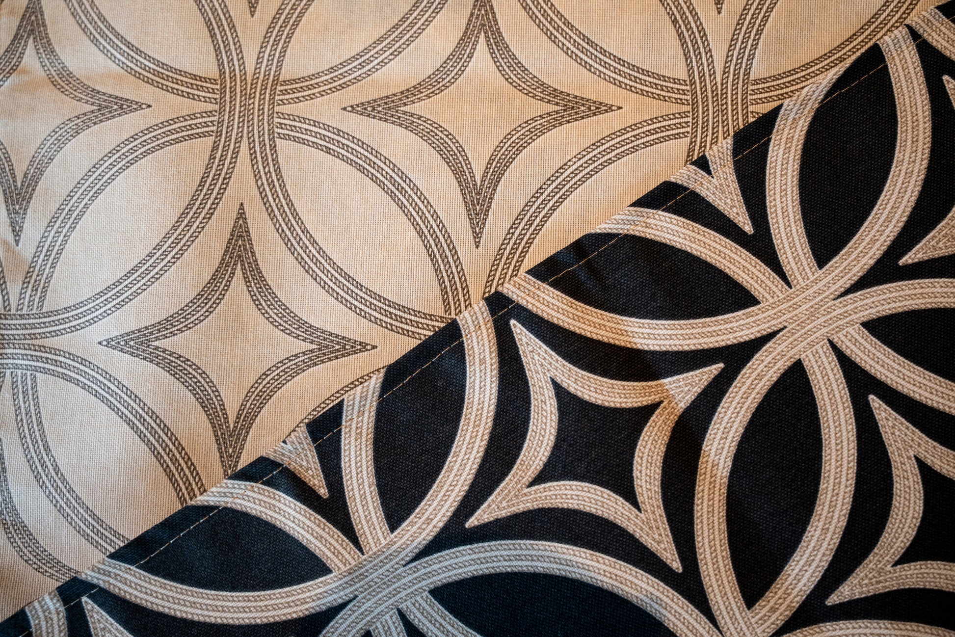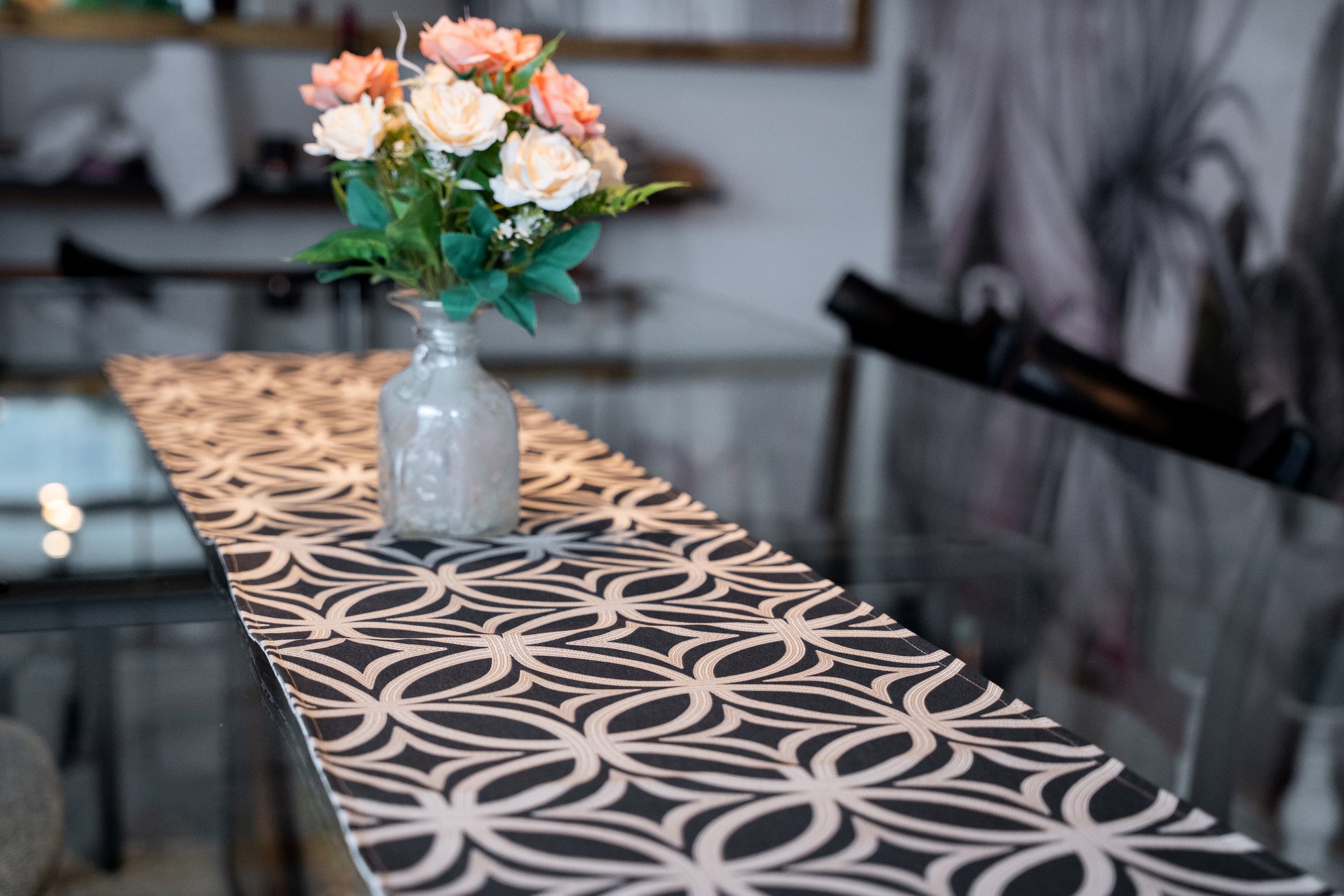 Dale carácter a tu mesa con este camino reversible de 180x32 cm, que une dos estampados modernos y atrevidos: Sicodélico Beige y Sicodélico Negro. Ideal para quienes aman jugar con contrastes, texturas y formas. Confeccionado con tela repelente al líquido y acabados artesanales que hacen de cada pieza algo único.