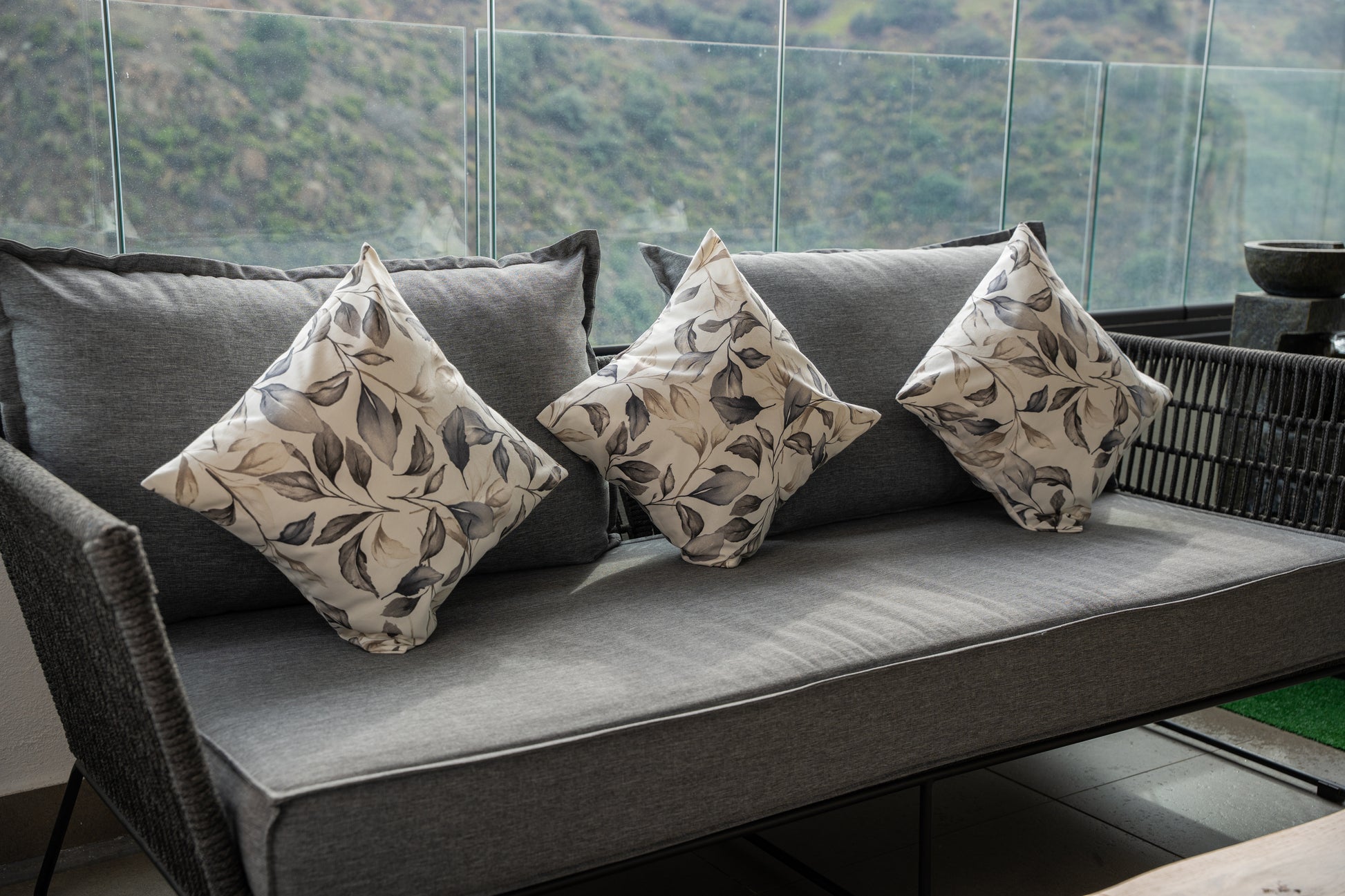 La funda Hojas Blancas (45x45 cm) aporta luz y sutileza a cualquier espacio. Ideal para combinar con colores neutros o destacar sobre fondos oscuros. Su tela resistente y repelente al líquido es perfecta para una decoración que se disfruta sin preocupaciones.